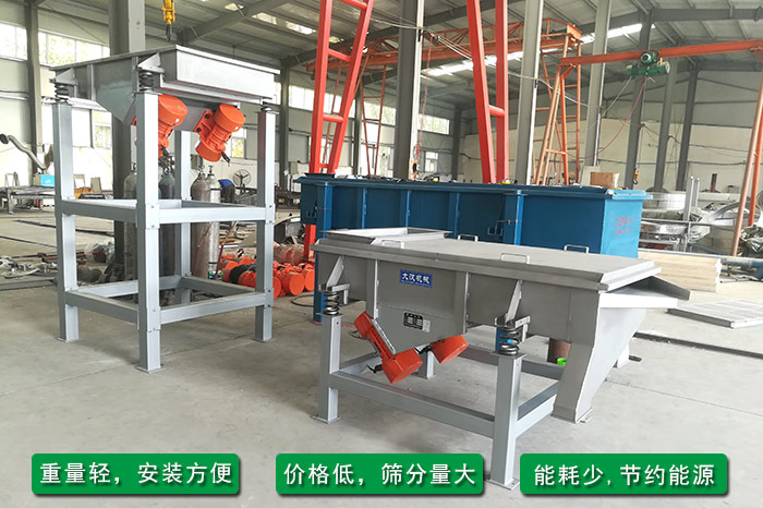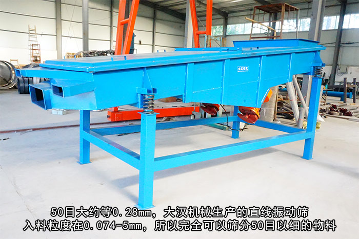 50目指在一平方英寸的面積上有50個孔,50目大約等0.28mm,大漢機械生產(chǎn)的直線振動篩入料粒度在0.074-5mm,所以完全可以篩分50目以細的物料。同時直線振動篩適合篩分物料含水量要小于70%、無粘性的各種干式粉狀物料。