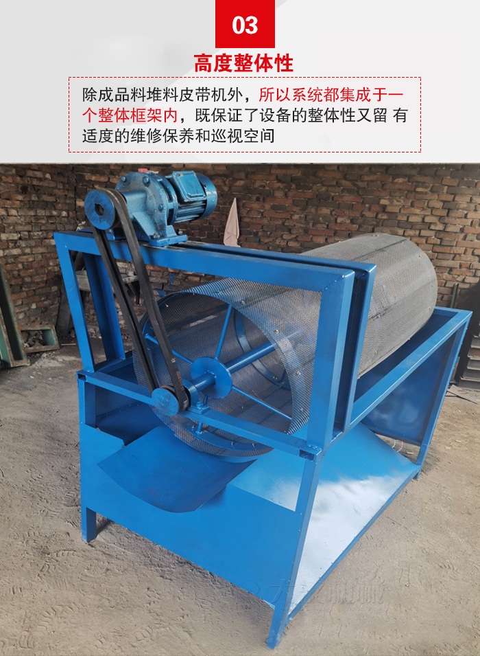 該產(chǎn)品的主要依靠驅(qū)動(dòng)裝置帶動(dòng)滾筒篩網(wǎng),對(duì)于物料做360°旋轉(zhuǎn)時(shí)篩分,在滾動(dòng)篩網(wǎng)的作用下,物料能夠輕松的達(dá)到分散的狀態(tài),從幫助篩網(wǎng)進(jìn)行快速的篩分。通過(guò)篩網(wǎng)網(wǎng)孔的物料留到皮帶輸送機(jī)上,由出料口排出,而沒(méi)有通過(guò)篩網(wǎng)篩分的將從肥料口排出,從而完成物料的篩分目的。