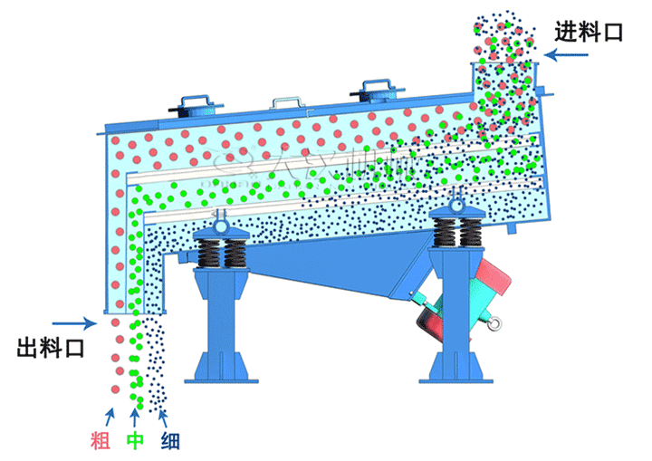 石英砂篩分機(jī)利用振動(dòng)電機(jī)激振作為振動(dòng)源,使物料在篩網(wǎng)上被拋起,同時(shí)向前作直線運(yùn)動(dòng),物料從給料機(jī)均勻地進(jìn)入篩分機(jī)的進(jìn)料口,通過(guò)多層篩網(wǎng)產(chǎn)生數(shù)種規(guī)格的篩上物、篩下物、分別從各自的出口排出